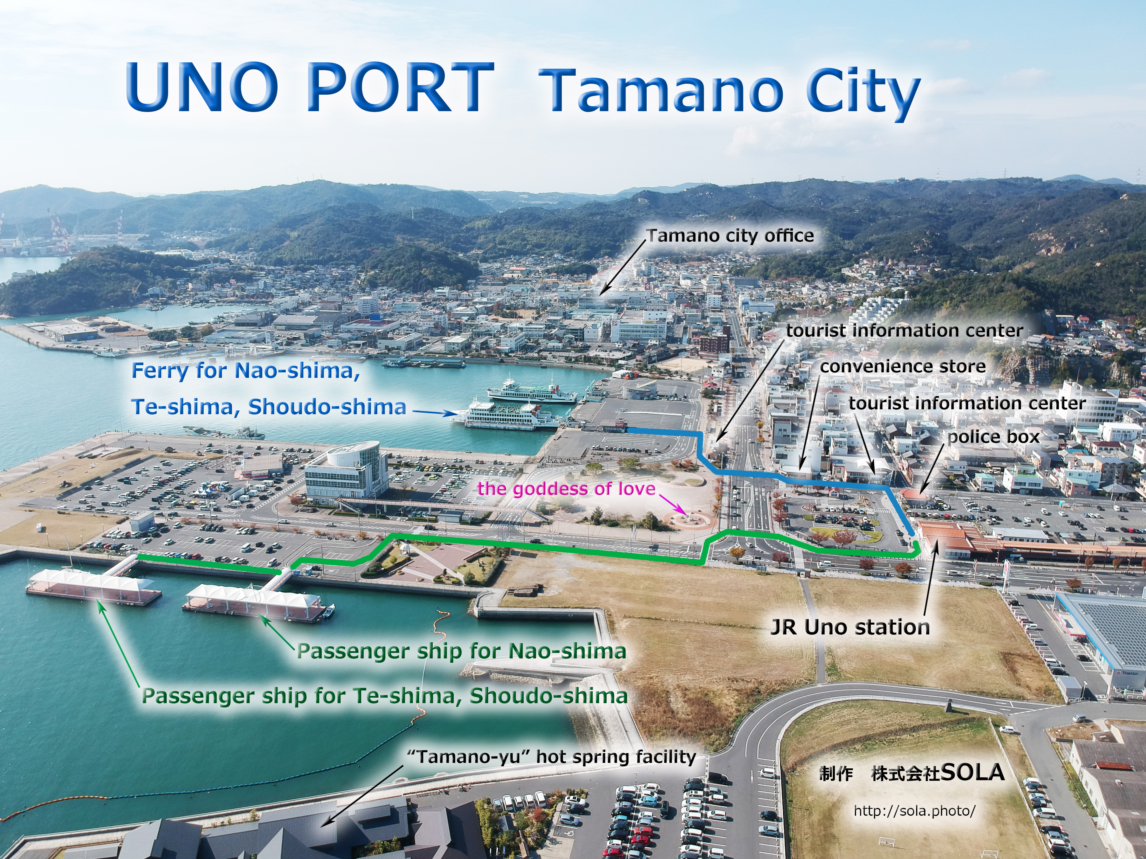ほとんどの方が「JR宇野駅」からフェリーターミナル(青線)又は浮桟橋(緑線)から船で「直島」等へ渡られます。